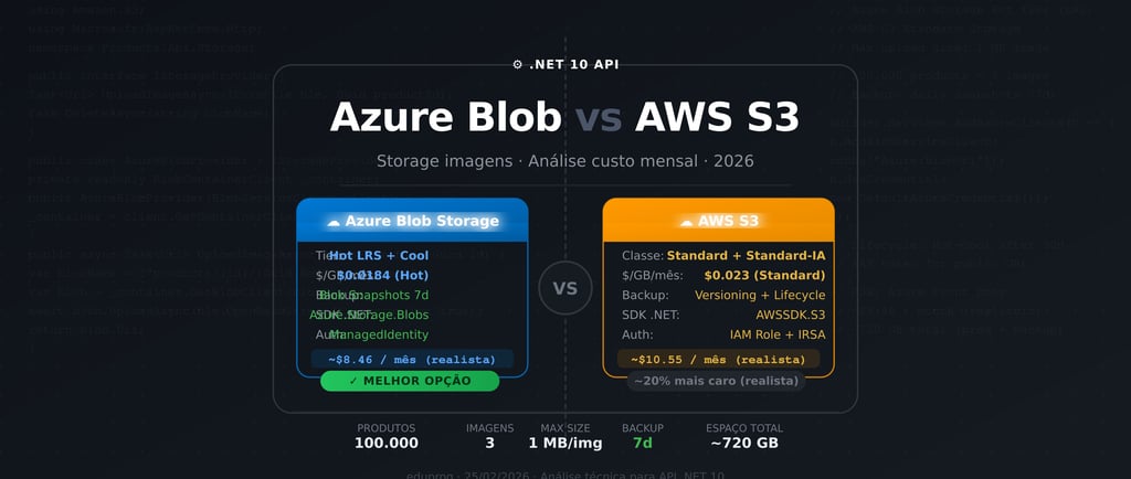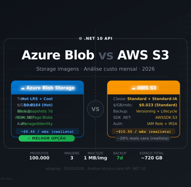 Estimativa real de custo mensal para armazenar imagens de produtos em uma API .NET 10 — com análise de backup, redundância e recomendação definitiva.